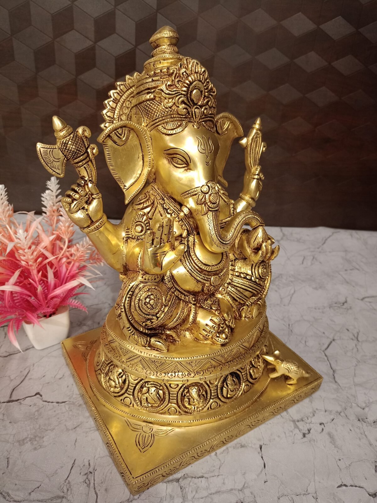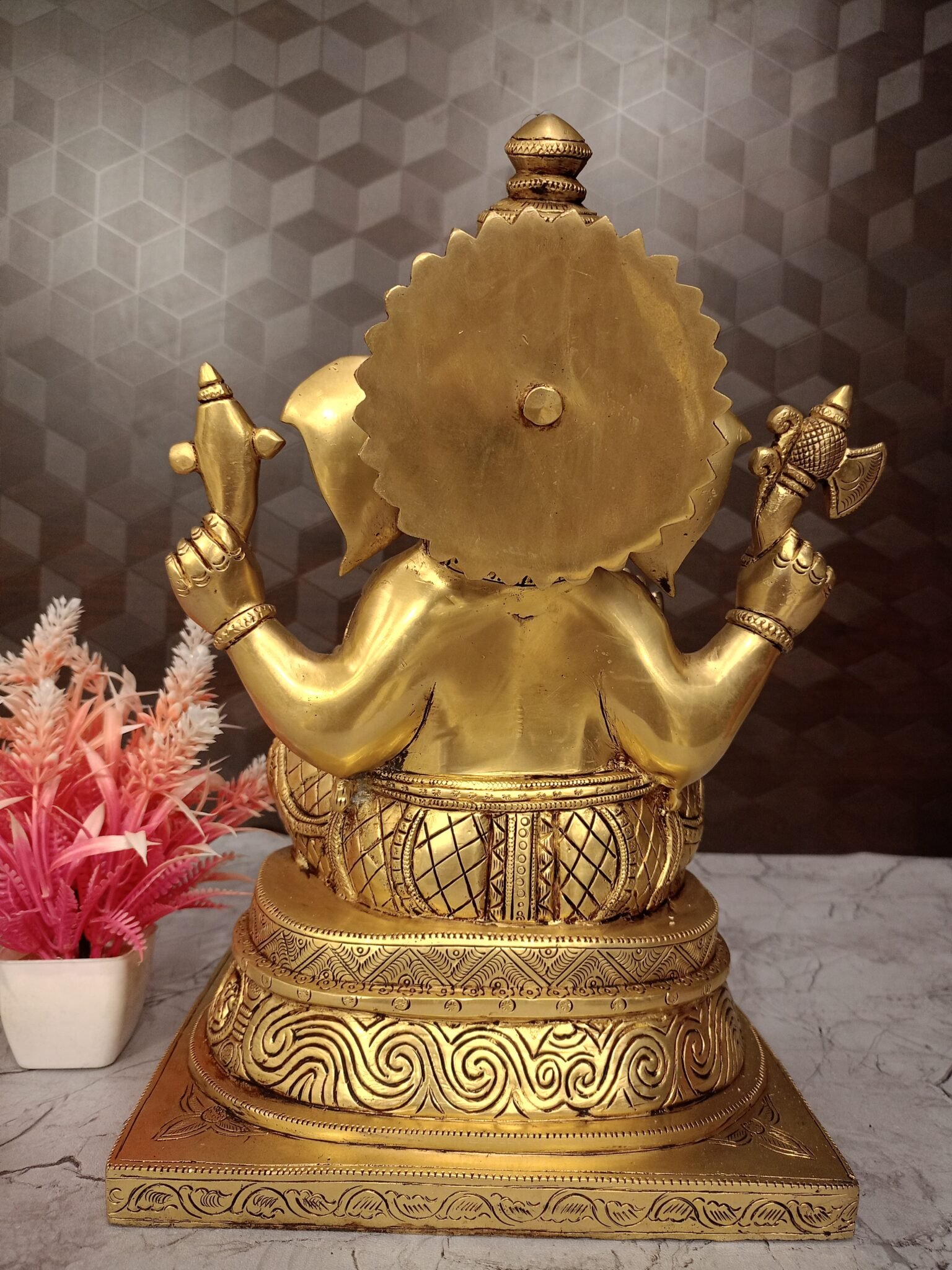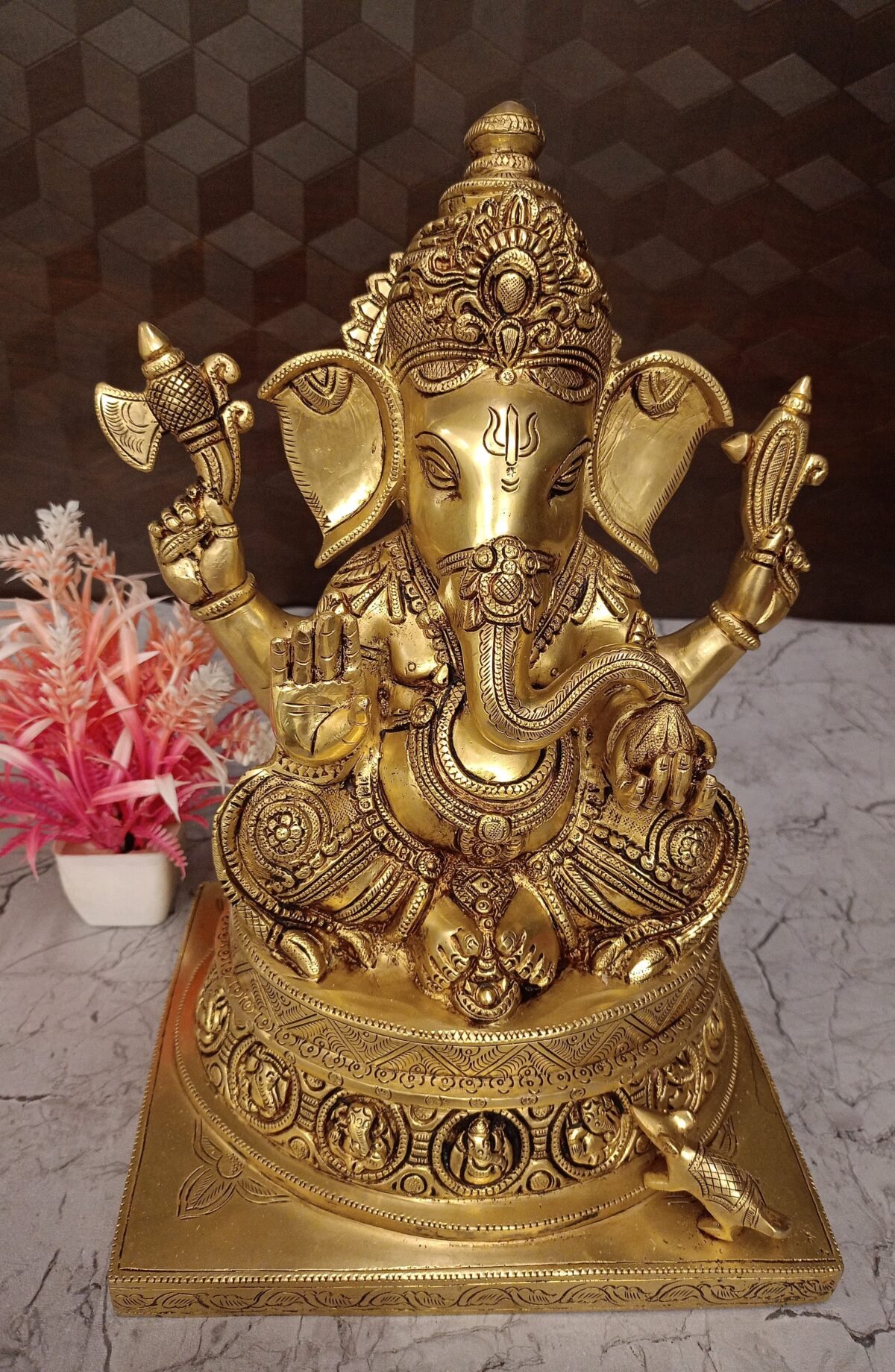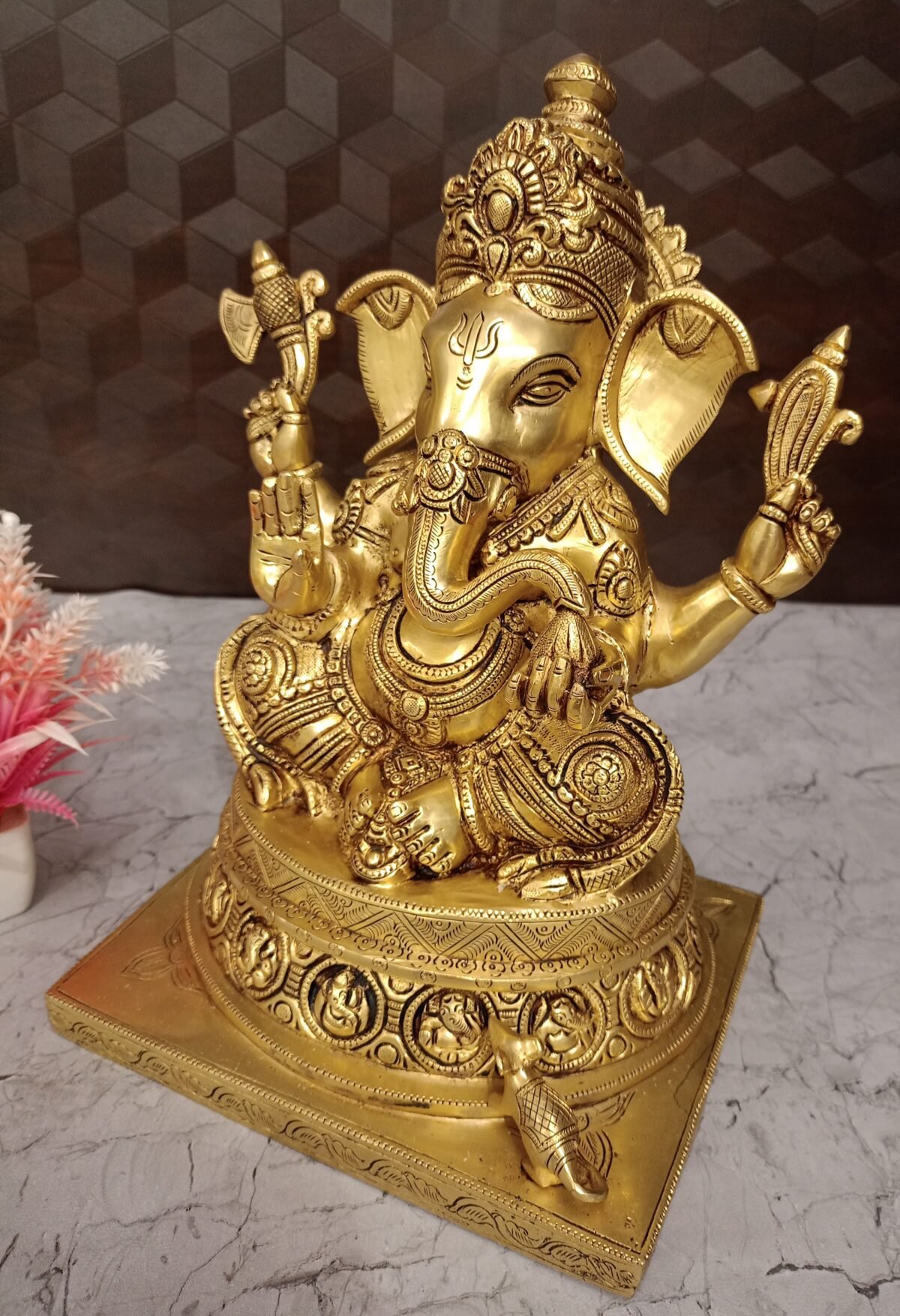 Lord Ganesha is in the sitting position, he has four hands and also has Square designs on his Sitting Base. Also, there is a carving design portrayed in the arch and base of this idol. This is also a black antique finish statue which add more beauty to the small carvings. This idol Gifting to Marriage, Housewarming Functions Also.
