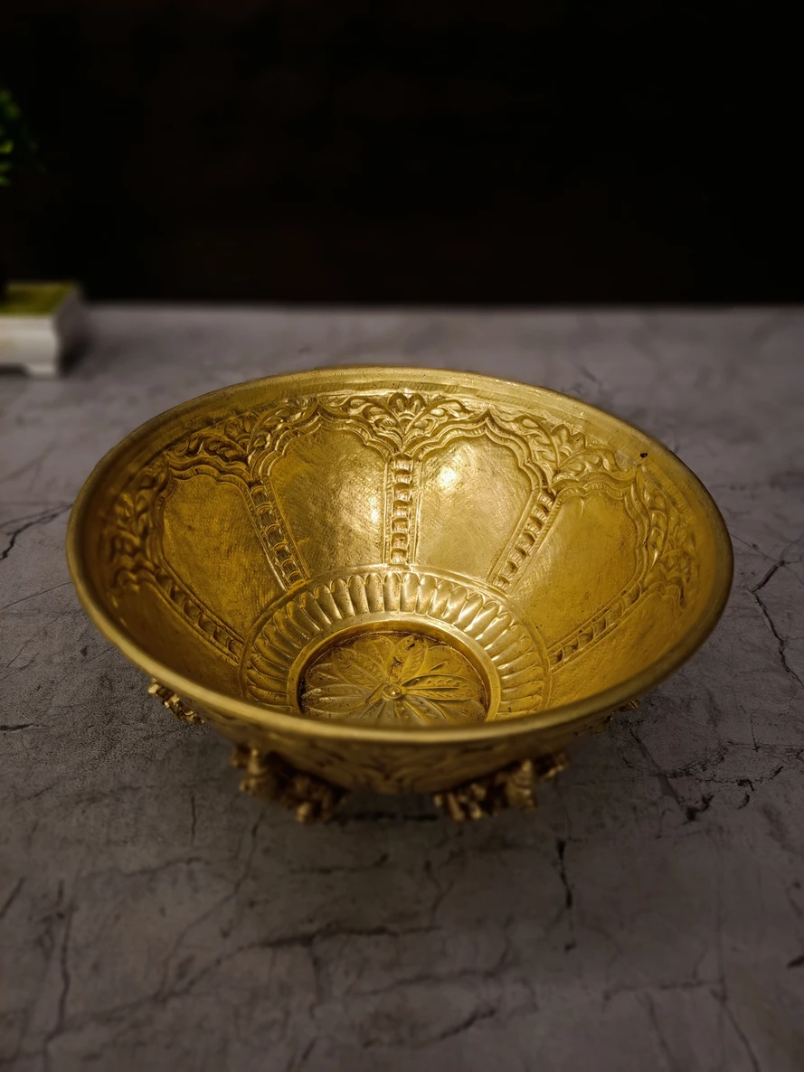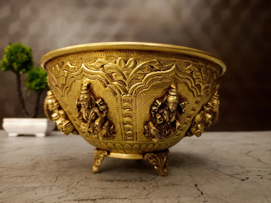 The Brass Ashtalakshmi Uruli is a traditional vessel featuring the eight forms of Goddess Lakshmi, known as the Ashtalakshmi. This piece serves as a symbolic anchor for wealth, health, and spiritual abundance in a home.