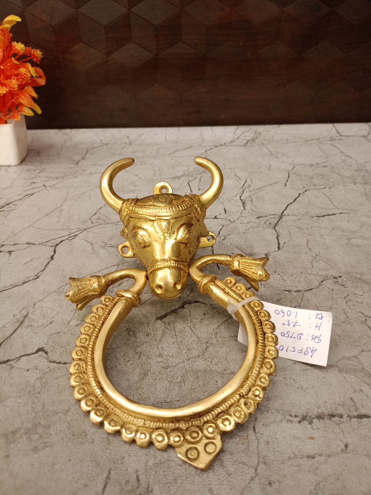 The brass bull head piece you have is a door knocker, a functional and decorative piece of hardware for the entrance of a home.