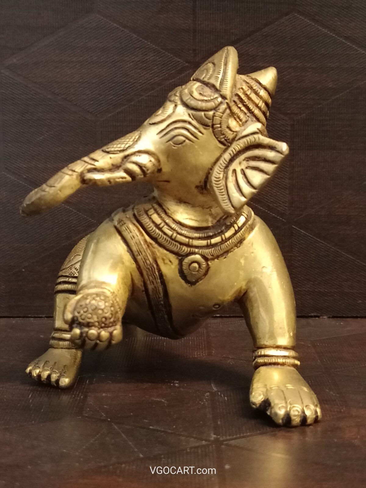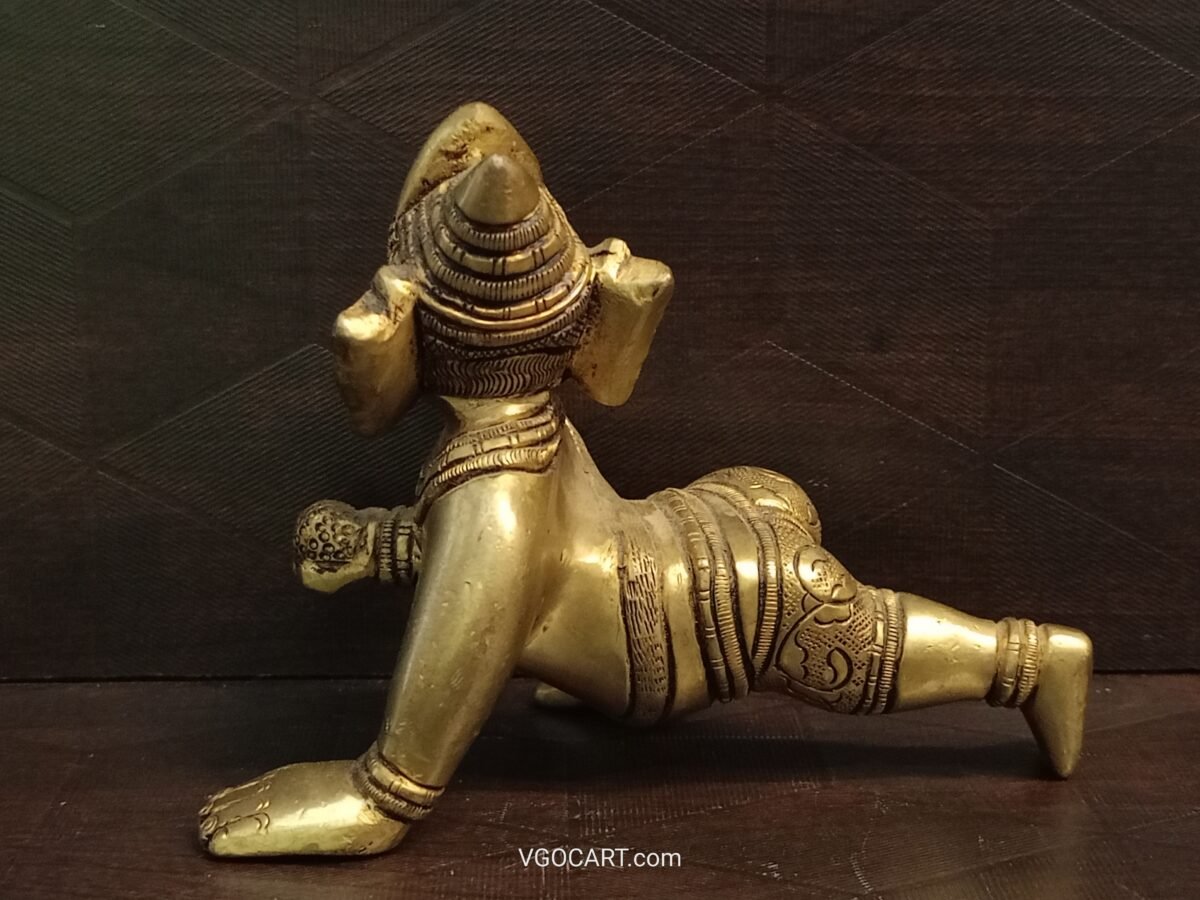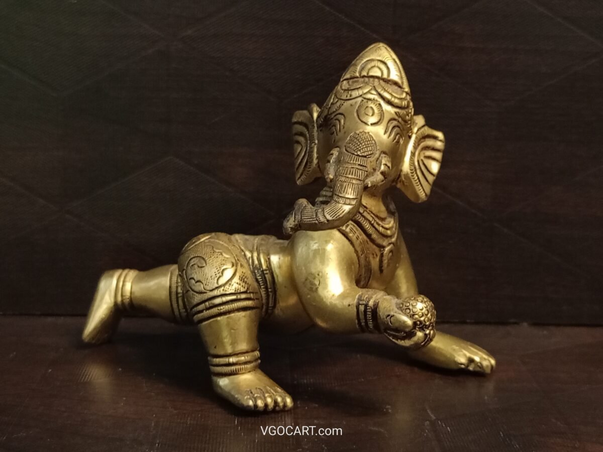 Brass Crawling Baby Ganesha Idol is handcrafted with quality brass metal, this baby Ganesha comes up with the posture of crawling and keeping laddu in his right hand. Baby Ganesha idol is crafted by a skilled artisan of Timbr Decor.