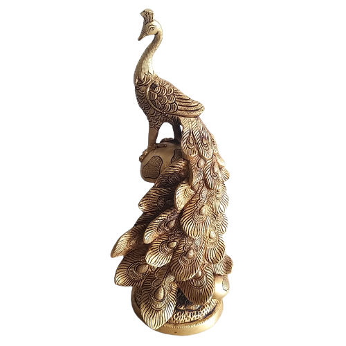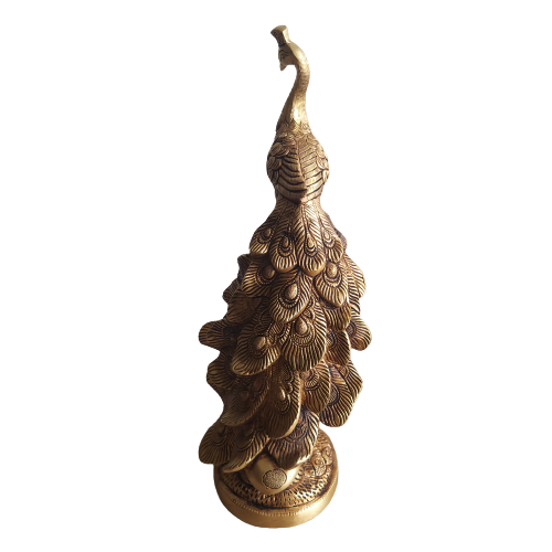 Brass Decor Peacock Statue is handcrafted and depicted in a grand way of standing on a base and finished with black antiques. It has been crafted with artistic design.