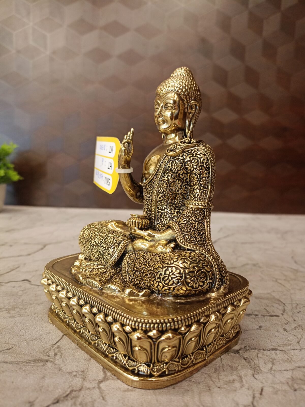 Brass Fine art Buddha’s feature is a powerful gesture of reassurance, protection, and fearlessness. The raised hand signifies a blessing and a promise of divine protection, helping to dispel fear and grant security.This meditative posture represents deep concentration, stability, and the state of enlightenment he achieved.It serves as a visual reminder to practice mindfulness and meditation, aiding in focus and concentration.The Abhaya Mudra specifically brings a powerful sense of security, courage, and protection from harm.Place this serene Buddha idol in your sacred space to foster a sense of peace, courage, and spiritual harmony