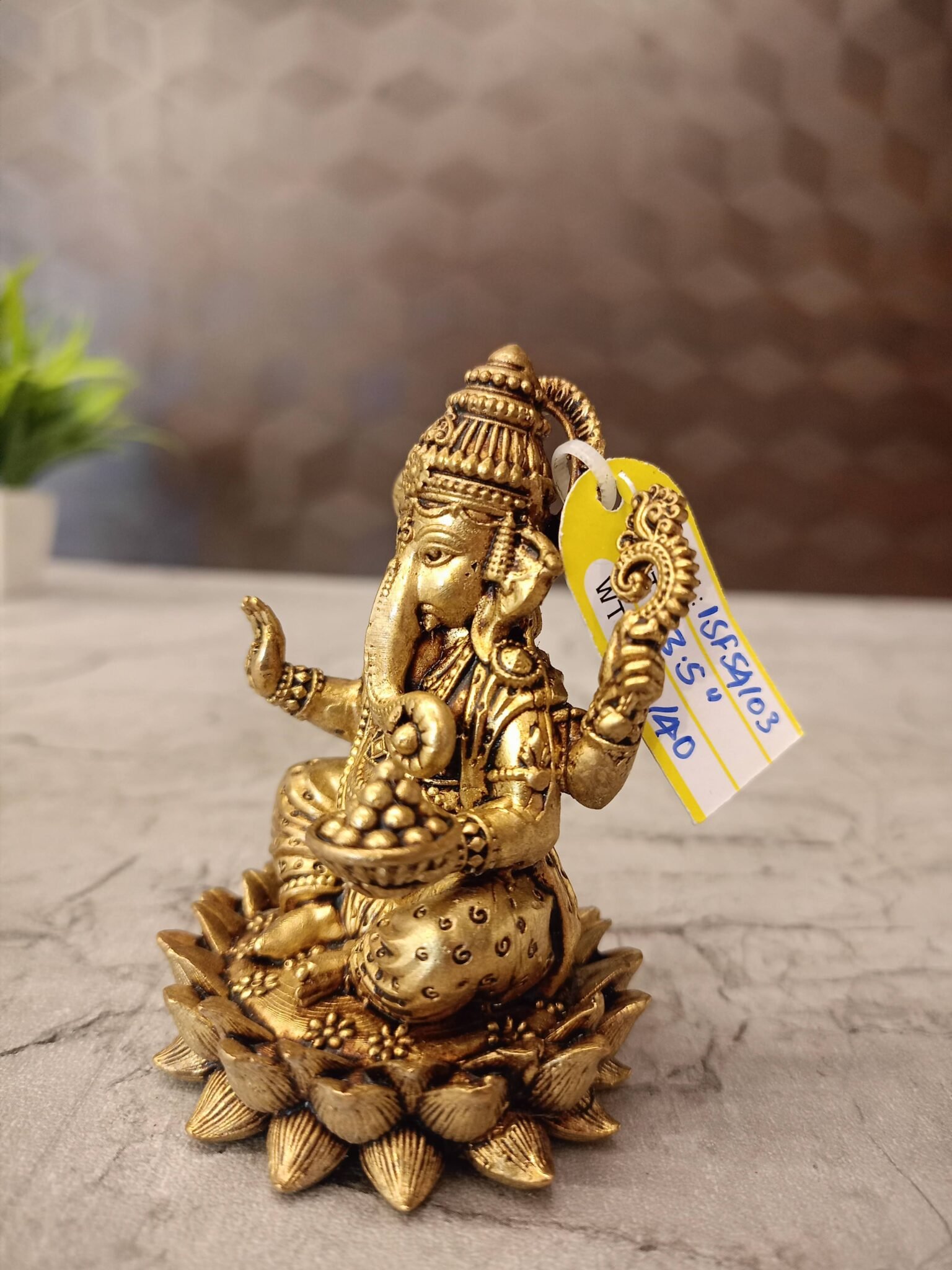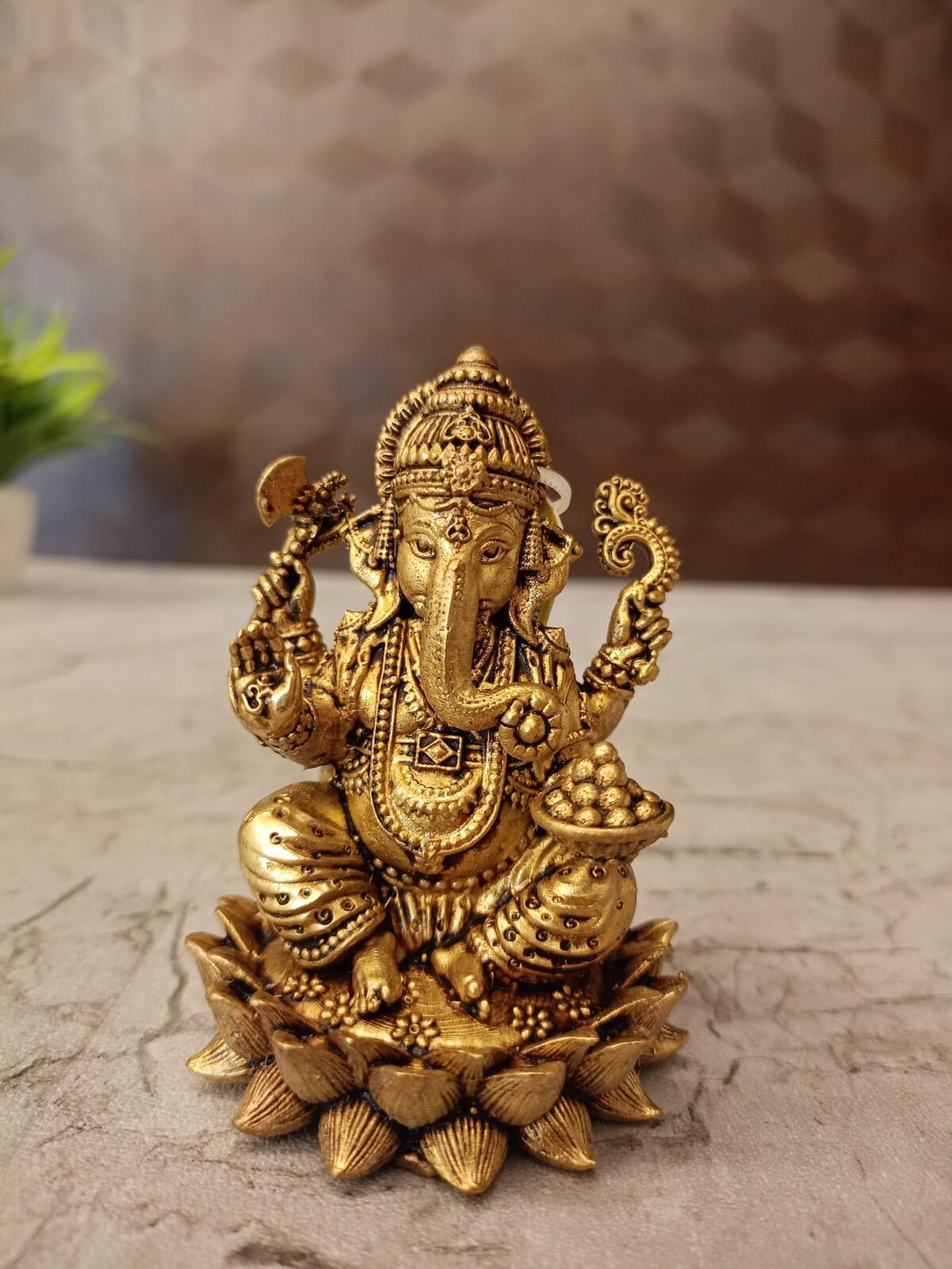 A Brass statue of Ganesha, a popular Hindu deity known as the remover of obstacles and the god of wisdom and prosperity. The statue is depicted in a seated position on a lotus flower, with his characteristic elephant head, multiple arms, and a pot of sweets.