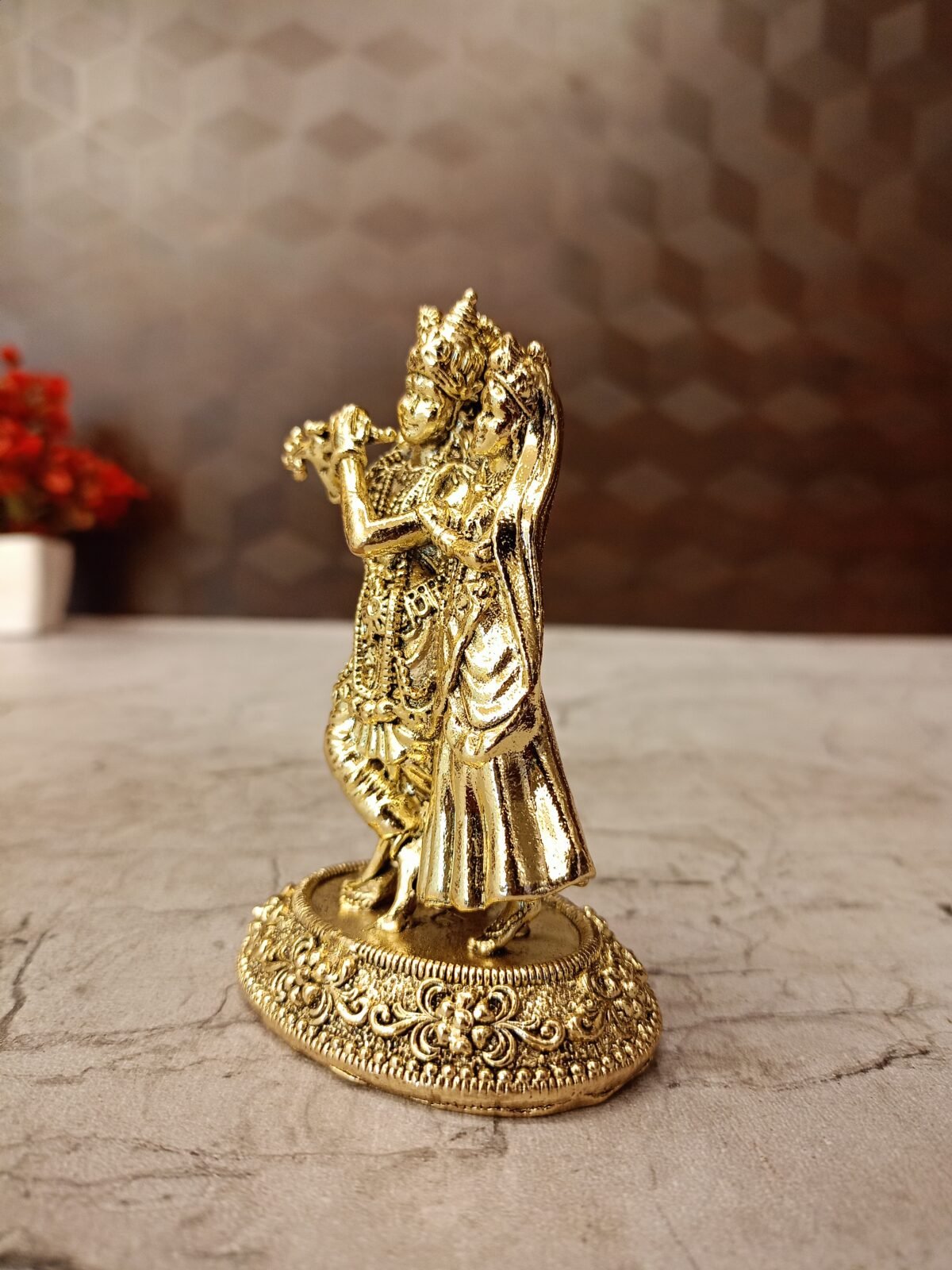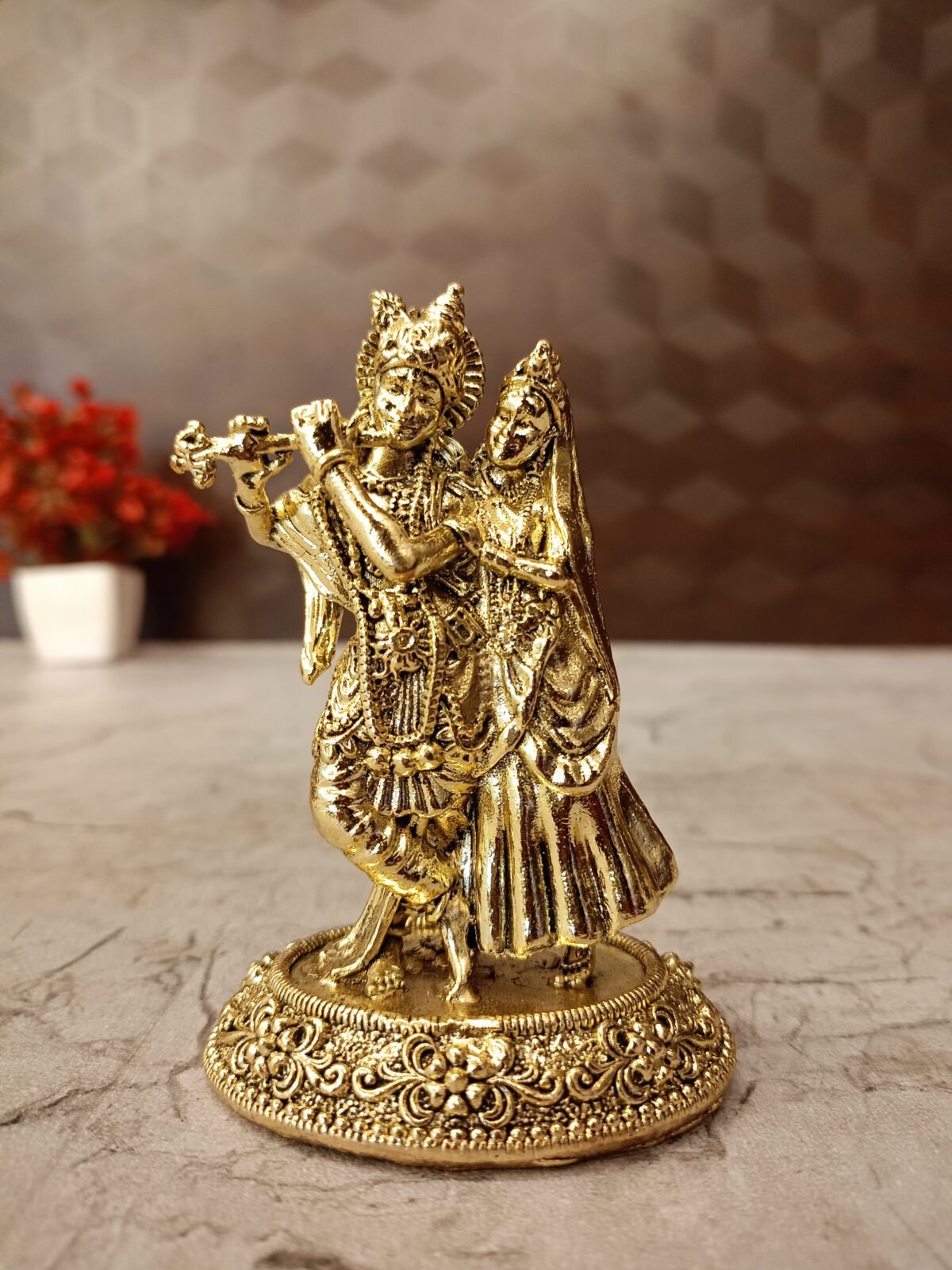 Brass Fine art Radha Krishna Idol is beautifully sculpted statue captures the divine couple in a loving embrace, with Lord Krishna playing his enchanting flute with intricate details on their divine attire, ornaments, and crowns. The richly patterned round base adds to its elegance, making this idol a powerful symbol of pure love, devotion, and harmony. It is a perfect centerpiece for your home altar, living room, or as a cherished gift that symbolizes lasting love.Placing a Radha Krishna idol in the home is believed to strengthen the bond between family members, fostering love, understanding, and affection, particularly between couples.