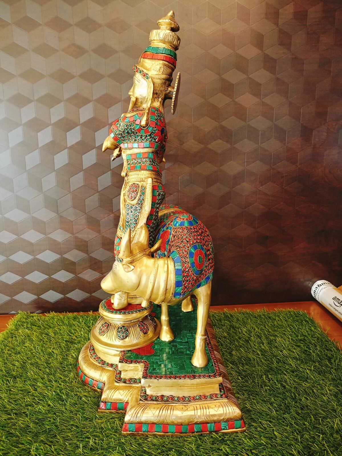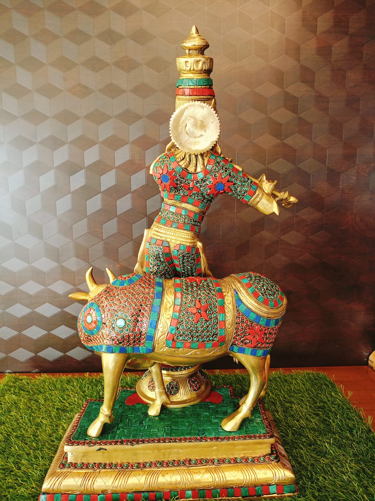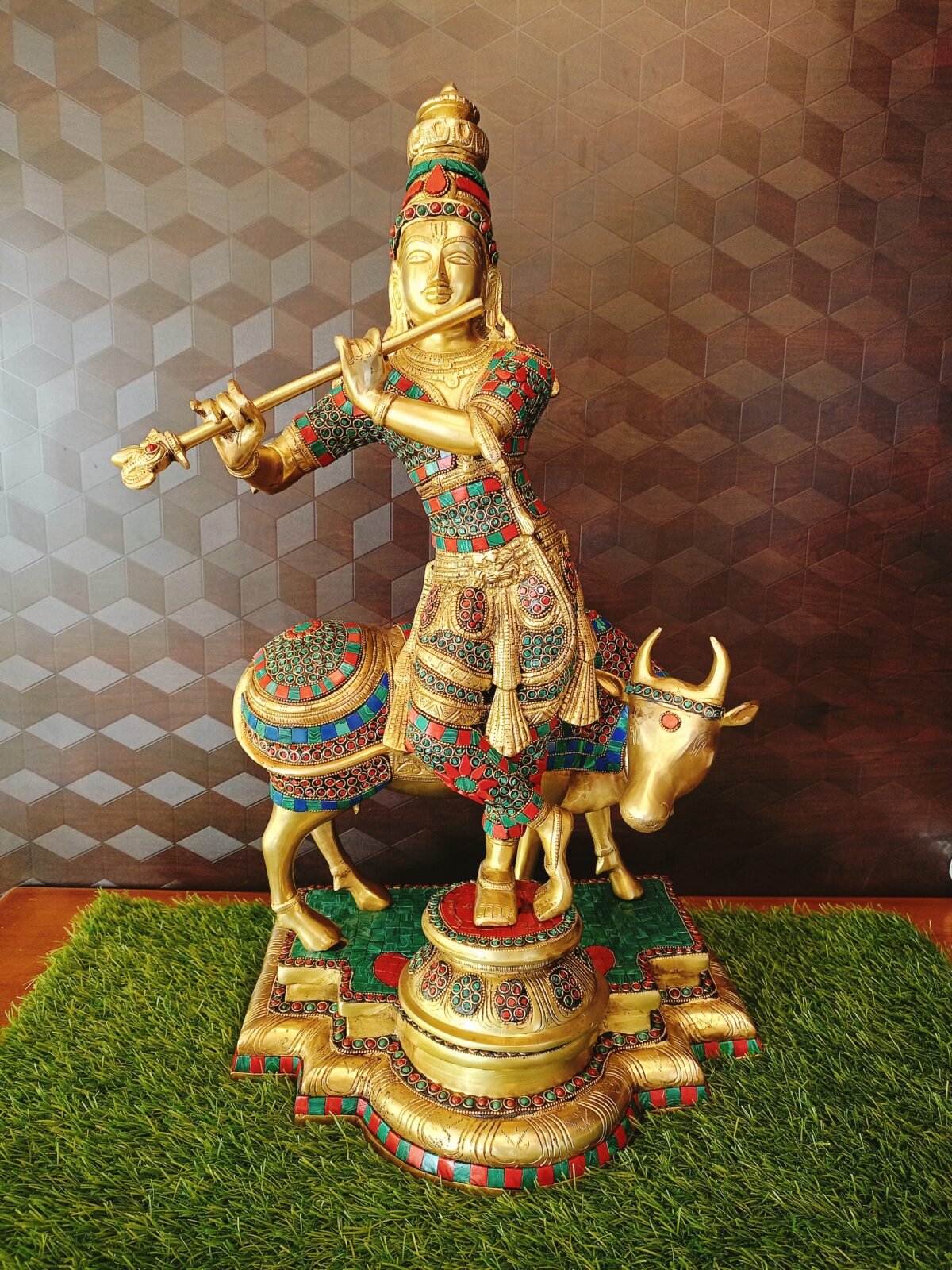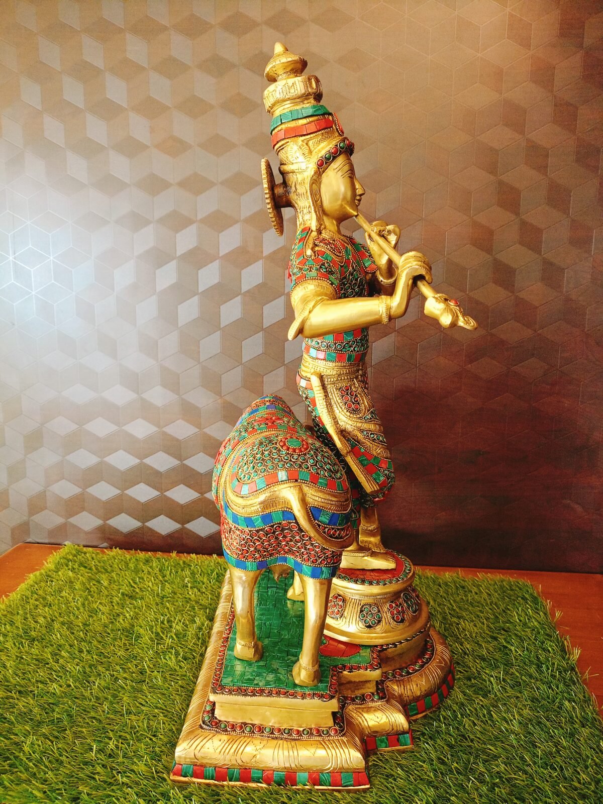 Brass Krishna With Cow is finely handcrafted idol with Multi colour stone finish by TimbrDecor Artistian