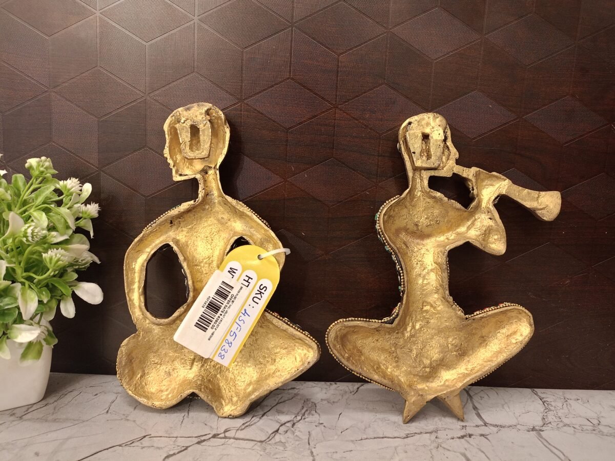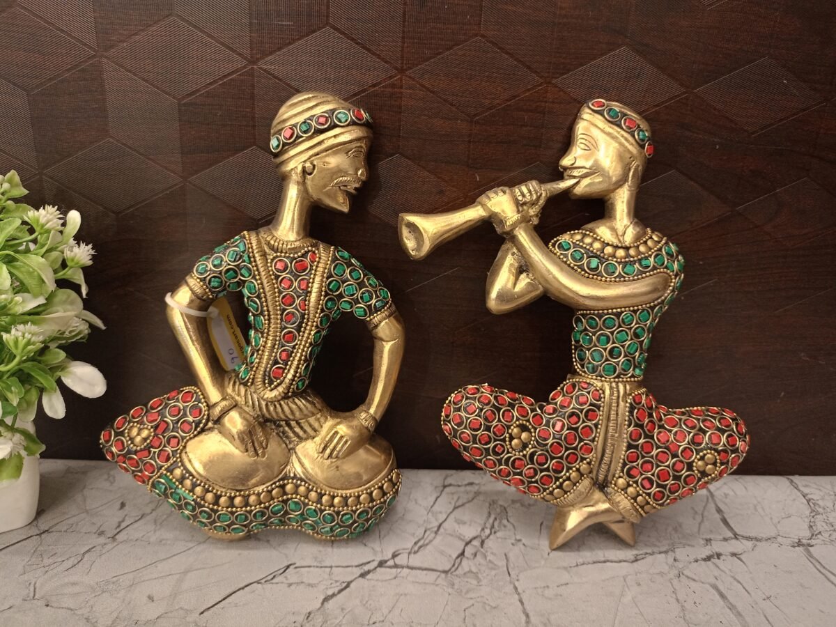 The brass and stone wall mounts of tribal musicians, like the one in the image, are a classic example of Indian folk art. This style of handicraft is often referred to by the tribe or region it originates from, such as Dokra art, which is a well-known metal casting technique from Eastern India.
