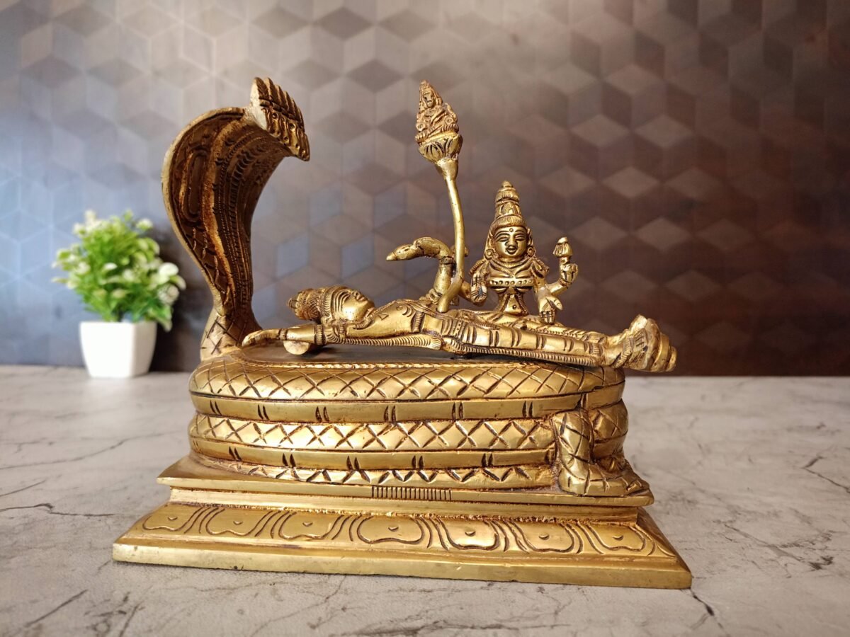 Brass Padmanathar statue is fine handcrafted idol made up of Pure brass.Padmanathar is the form of Mahavishnu in reclining Position on sesha (five headed snake) with sridevi and Brahma on the top on cosmic Ocean.