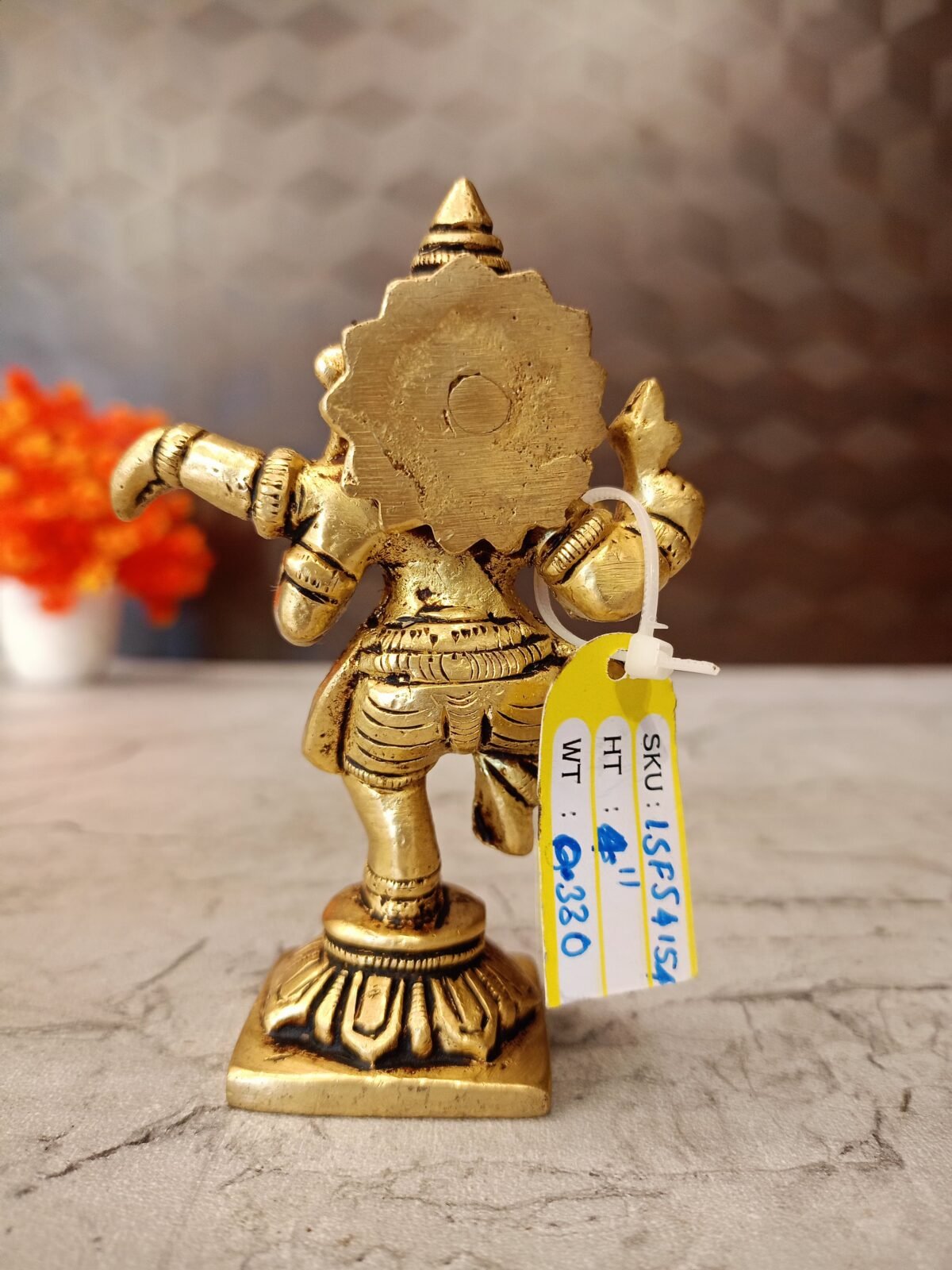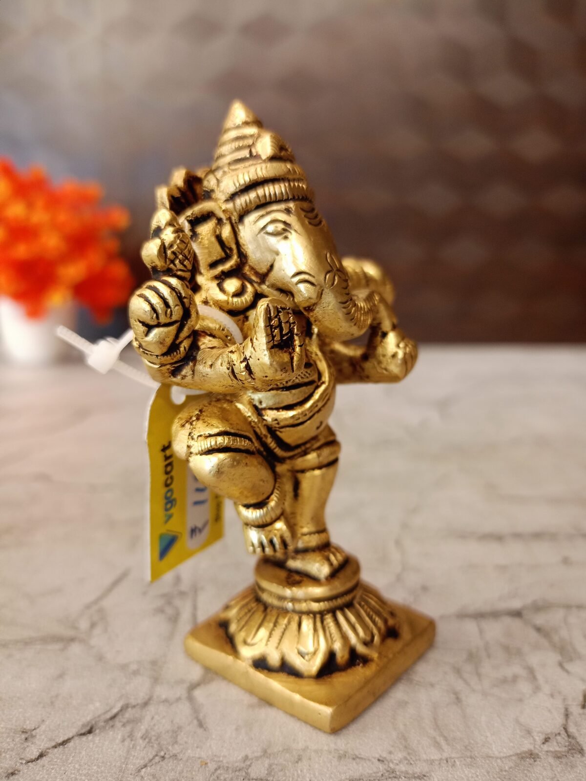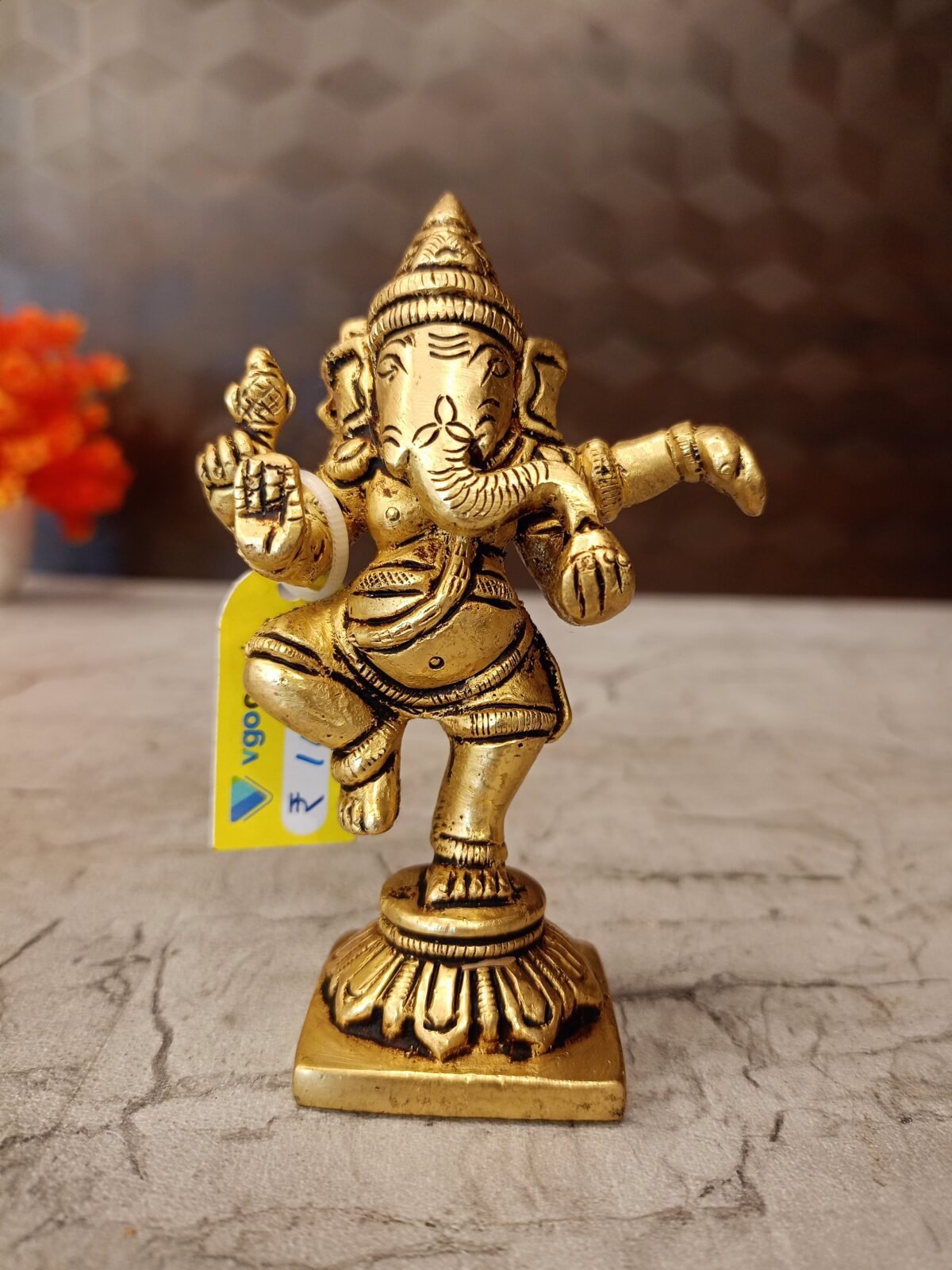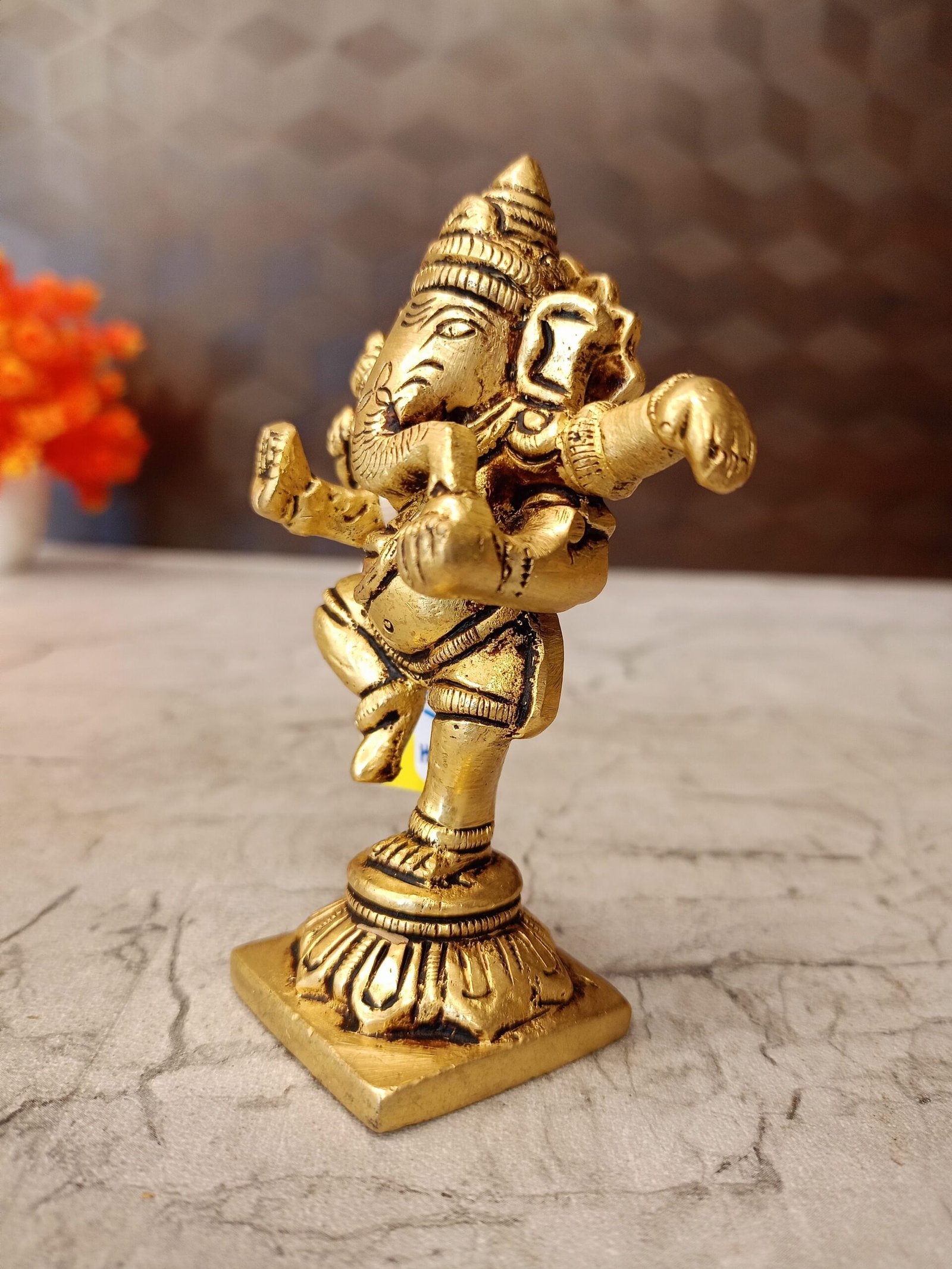 A Brass statue of Lord Ganesha in a dancing pose. This type of statue is often referred to as a “Dancing Ganesha” or “Nataraja Ganesha”. It’s a popular choice for home decor and worship, as it symbolizes joy, rhythm, and the balance between creation and destruction.